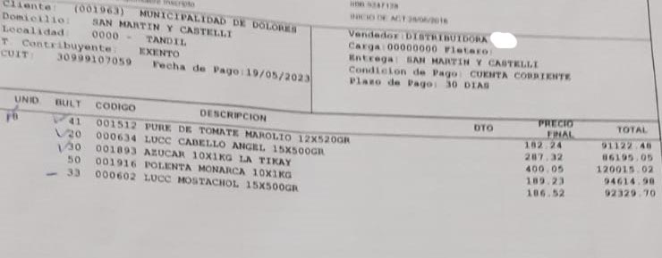 Pero yendo al tema puntual, pudimos conocer de una compra efectuada por la Secretaría de Acción Social municipal a una firma de Tandil a mediados del pasado mes de abril, a la que se le adquirió según el remito por un monto de casi 500 mil pesos, puré de tomate, fideos cabello de ángel, mostachones, azúcar y polenta, cuyos precios comparados al día de hoy con los de “venta al público” en un supermercado de nuestra ciudad, inflación mediante resultan entre un 20 y un 25% superiores.