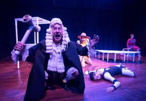 Creo que está muy presente. Hemos descubierto los personajes y los hemos explorado a partir del juego. Los personajes son muy definidos, tienen roles muy claros. Es una familia disfuncional y se produce un juicio porque el hijo se ha muerto, en un accidente aparentemente, o un asesinato. Es un poco lo que se juega: el matrimonio, un muerto, que es el hijo, un juez, y el tribunal, que es el público. El público asiste como tribunal de lo que está sucediendo, tiene participación, hay mucho trabajo y no hay cuarta pared, hay mucho trabajo hacia sala. Eso permite la técnica del clown, si no es distractivo y saca tanto para el público como el actor.