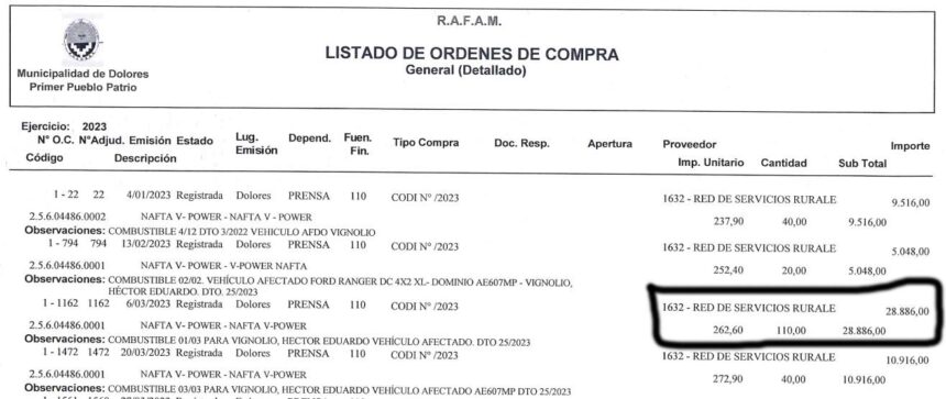 El siguiente es el detalle de las cargas de combustible que el ex Secretario de Prensa realizó según las Órdenes de Compra que emitió la Municipalidad, en las que se señala a su vehículo como el autorizado, debiendo puntualizarse sobre la registración la forma confusa en que la administración Etchevarren la realizaba, y que aparentemente los órganos de control no advertían o controlaban, ya sea en su emisión, fecha de carga, remitos y registración, más aún, cuando en varias oportunidades la cantidad de combustible autorizada para el vehículo del ex Director de Prensa excedía la capacidad del tanque de dicho rodado.